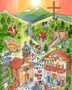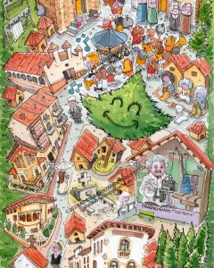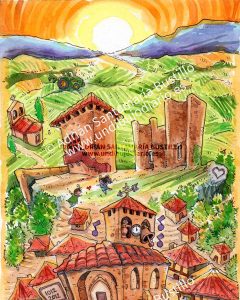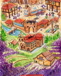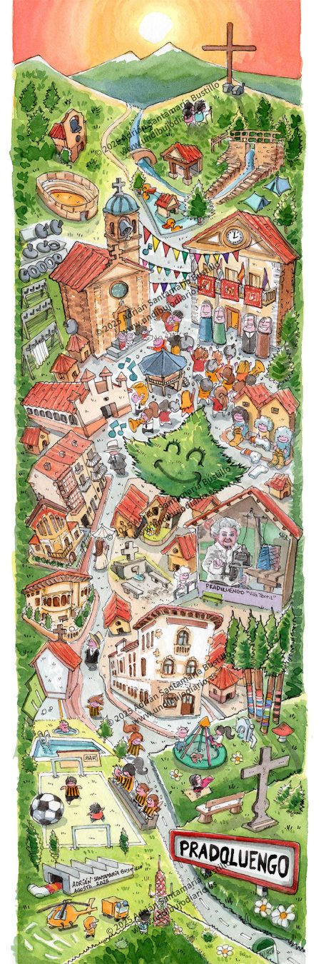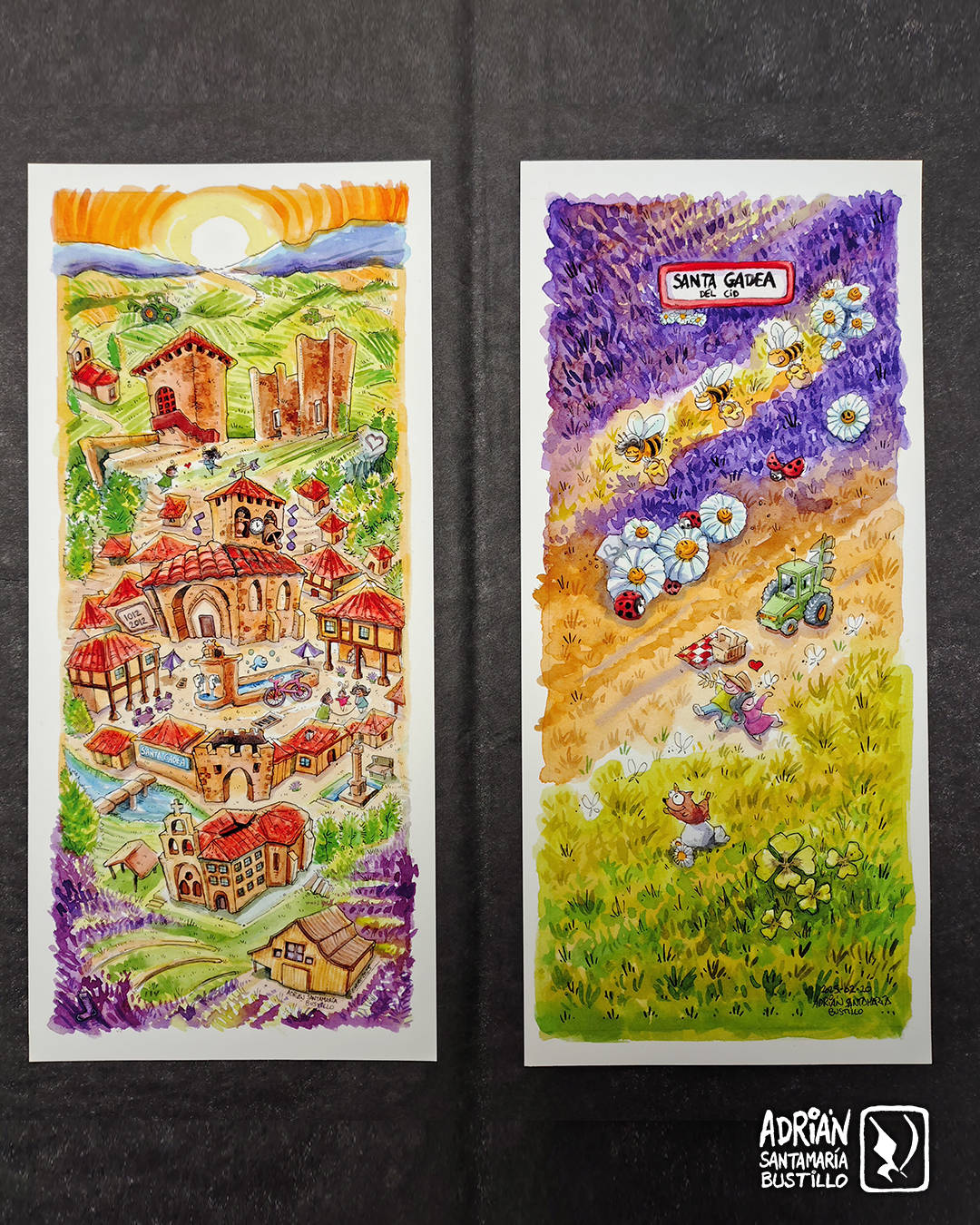 Este dibujo es inmenso. Es una obra bajo encargo de las gentes de allí que he dibujado y pintado de forma tradicional y está disponible como reproducción en lámina fabricada en mi estudio, y sublimada en calcetines de alto rendimiento fabricados íntegramente en España por RD socks . Es mi interpretación de este bello pueblecito su zona, gentes y colores.