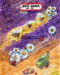 Detalle del castillo de Santa Gadea y los campos Detalle del Monasterio del Espino y el Granero Detalle de los campos de lavanda La parejita de agricultores La entrego con una hoja adjunta que contiene la explicación de todos los elementos del dibujo. Desde la ermita al cartel del milenario, las casas soportaladas, etc…